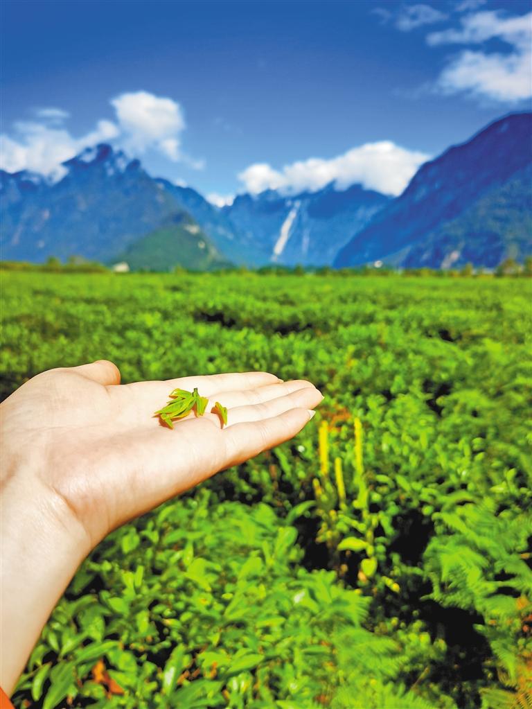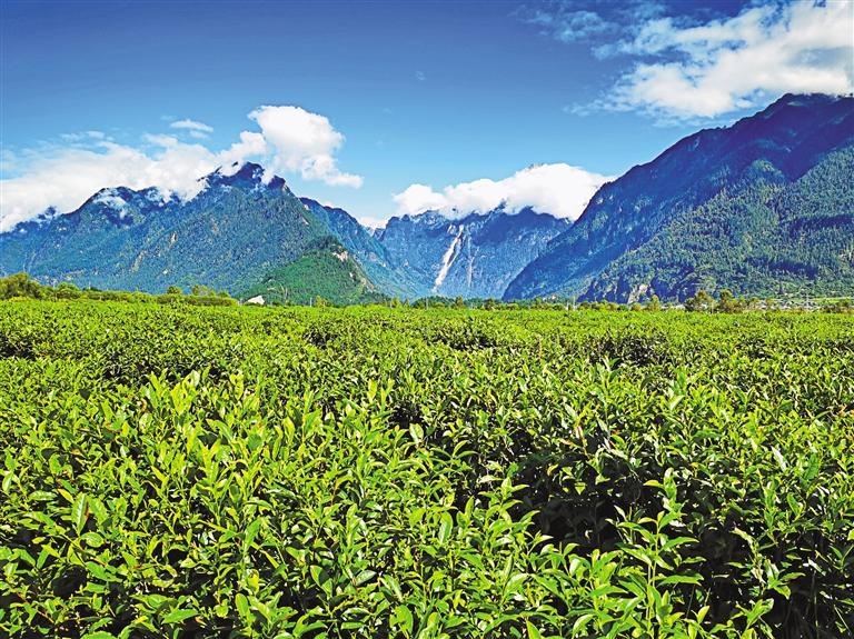 眼前,翠綠欲滴的千畝茶田連接碧色天空,連綿不絕的雪山聳入云霧,清水潺潺的聲音環(huán)繞耳邊,牛羊時(shí)不時(shí)抬頭望向行人。易貢茶場(chǎng)平均海拔2200米,雖地處青藏高原,但來(lái)自印度洋的暖濕氣流沿著雅魯藏布大峽谷進(jìn)入高原,為這片高原茶田帶來(lái)豐沛的降水?!岸瑹o(wú)嚴(yán)寒,夏無(wú)酷暑”,使茶樹(shù)能夠在這里茁壯成長(zhǎng)。