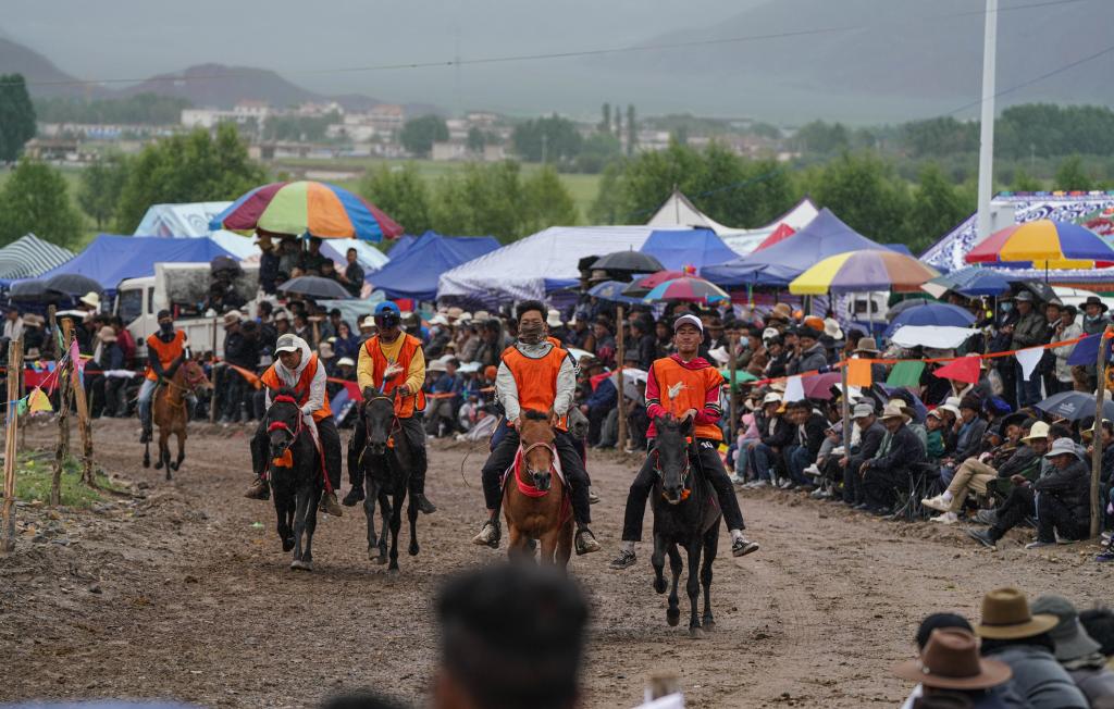 23日,在拉薩林周縣甘旦曲果鎮(zhèn)江角村的賽馬場上,選手邊瑪益丹穿著輕便的馬術運動服,上身貼緊棕色馬背,右手的馬鞭在空中打著旋,和他的愛馬進行最后沖刺。
