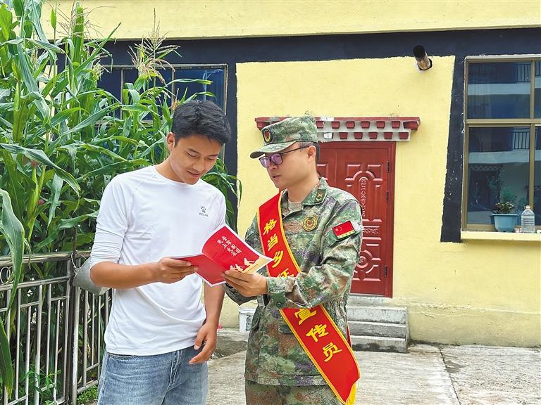 圖為為積極響應(yīng)國家號(hào)召,扎實(shí)做好征兵工作,墨脫縣格當(dāng)鄉(xiāng)人武部走村入戶向群眾宣傳征兵相關(guān)政策,不斷激發(fā)適齡青年參軍入伍的熱情。這是格當(dāng)鄉(xiāng)人武部部長(zhǎng)陳杰到群眾家中進(jìn)行征兵宣傳。記者 王敏 通訊員 郎玲 攝