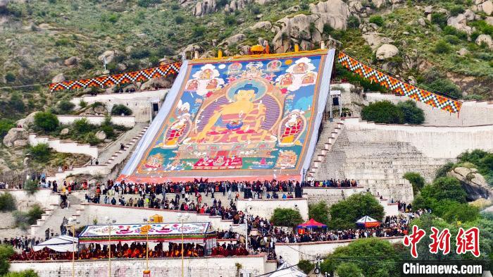 在哲蚌寺,記者看到,信眾、游客沿著山道緩緩前行,秩序井然。展佛臺(tái)下,人們向巨幅釋迦牟尼唐卡拋出寓意吉祥的哈達(dá)。中午12時(shí)許,中新社記者前往色拉寺,巨幅強(qiáng)巴佛唐卡已展開(kāi),供民眾瞻仰。