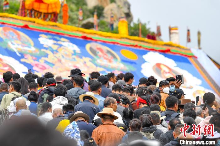 記者跟隨信眾和游客沿著山道緩緩前行,共同目睹那震撼人心的展佛儀式。當(dāng)巨大的釋迦牟尼佛像唐卡徐徐展開,信眾們向巨幅釋迦牟尼唐卡拋出寓意吉祥的哈達(dá),雙手合十,眼中滿是敬畏與虔誠,口中念念有詞,誠摯地祈禱著風(fēng)調(diào)雨順、幸福安康。