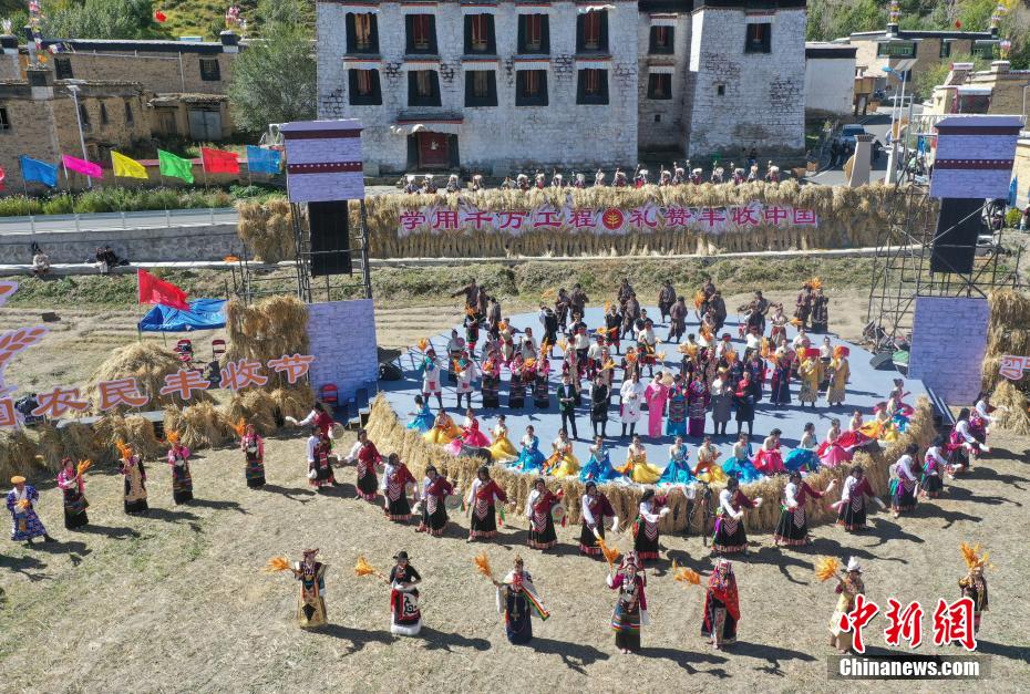 9月22日,2024年西藏“中國農(nóng)民豐收節(jié)”慶?;顒釉谏侥鲜协偨Y(jié)縣拉玉鄉(xiāng)強(qiáng)吉村舉行。活動以“學(xué)用‘千萬工程’禮贊豐收中國”為主題,由西藏各地(市)民間演出隊(duì)為大家獻(xiàn)上一場具有地域特色、體現(xiàn)農(nóng)牧民豐收喜悅的歌舞盛宴。圖為演出現(xiàn)場。(無人機(jī)照片)