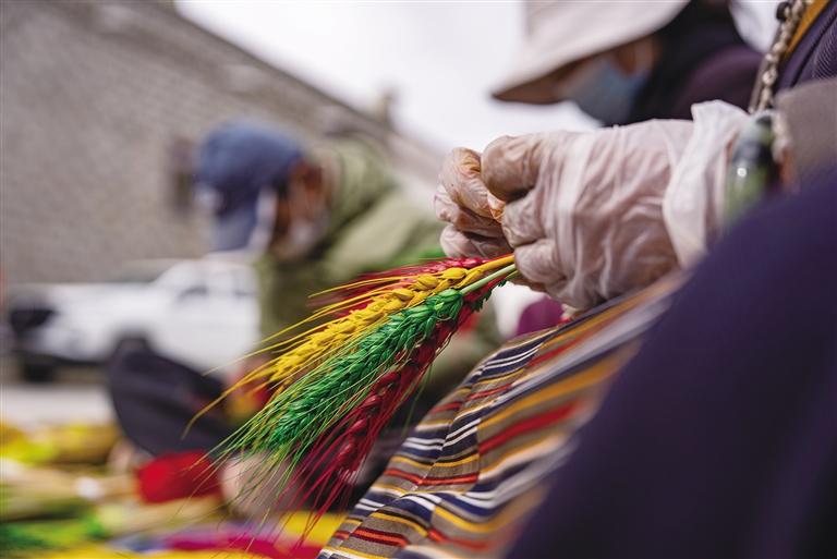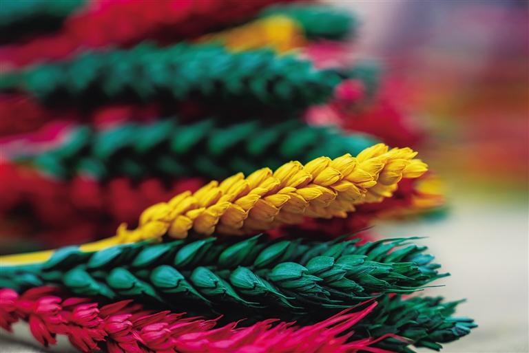 從春耕、夏耘、秋收到冬天的染色、晾干、捆綁、售賣(mài),“羅薩梅朵”的制作過(guò)程并不簡(jiǎn)單,種植和上色都極其辛苦。卓瑪次仁告訴記者:“每年4月,我們開(kāi)始種植小麥和青稞,澆水施肥。9月收割時(shí),我們會(huì)挑選顆粒飽滿的麥穗和青稞穗,捆綁后去皮曬干。10月,將它們收入屋中,一層層壘起來(lái),房間最好朝陽(yáng)且沒(méi)有老鼠。11月,開(kāi)始采購(gòu)顏料和捆扎用的毛線?!?/p>