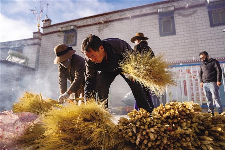 走進(jìn)桑木村,房屋錯(cuò)落有致,廣場(chǎng)上,村民們?cè)诙张?yáng)下忙碌著。有的正在煮顏料為麥穗和青稞穗上色,有的正在捆綁曬干的“羅薩梅朵”。“為了方便制作,我們根據(jù)外形給這些麥穗和青稞穗起了名字,比如這個(gè)禿禿的叫‘古日’,這個(gè)最長(zhǎng)的叫‘扎日’,還有‘阿索’和‘梅朵’。”64歲的村民其米卓嘎與幾位姐妹圍坐在一起,一邊捆綁“羅薩梅朵”,一邊笑著向記者介紹,手上動(dòng)作絲毫未停?!昂芏嗳诉^(guò)年講究?jī)x式感,會(huì)選擇買(mǎi)齊這四種,但大部分人會(huì)從中選兩種?!?/p>