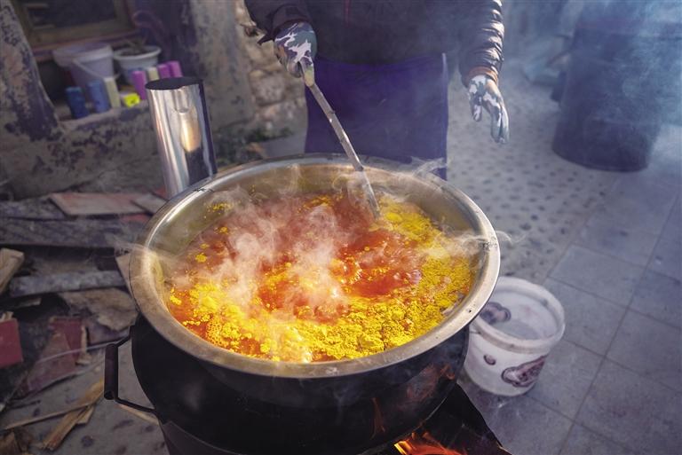 “玫紅色和黃色的都做完了吧?這個(gè)顏料水我倒了,開(kāi)始準(zhǔn)備制作青色?!币慌裕?1歲的央金將盆洗干凈,繼續(xù)煮水放入顏料?!啊_薩梅朵’有青色、綠色、玫紅色、黃色四種顏色,其中青色耗時(shí)最長(zhǎng),不僅需要自己調(diào)制,而且最難上色?!毖虢鹫f(shuō),“我們一般是早上7點(diǎn)開(kāi)始上色,上完色都快下午4點(diǎn)了?!?/p>