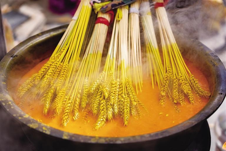 從金黃到色彩斑斕,“羅薩梅朵”的制作需要經(jīng)過(guò)收割、曬干、上色等數(shù)道工序,這是桑木村村民傳承至今的手藝。熱氣騰騰的顏料鍋旁,年輕的媳婦正在煮顏料;曬干的“羅薩梅朵”堆在一旁,一位奶奶和她的孫子正在有序捆綁。廣場(chǎng)上,年齡最大的村民近70歲,最小的12歲,年輕人從老一輩手中接過(guò)了文化傳承的接力棒。