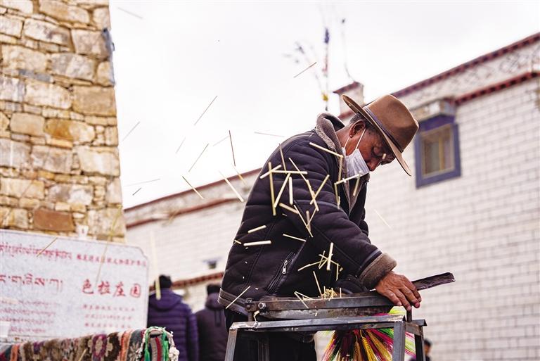 “一個(gè)人一天可以制作300到400捆‘羅薩梅朵’,批發(fā)價(jià)2元一捆,零售價(jià)5元一捆。每年賣(mài)完‘羅薩梅朵’后,我們就開(kāi)始置辦年貨了?!?1歲的央金家共有5口人,“羅薩梅朵”是她家的主要收入來(lái)源。每天早晨7點(diǎn),她家的燈光就已亮起。央金留在家中制作“羅薩梅朵”,丈夫和女兒則前往拉薩市區(qū)售賣(mài)。