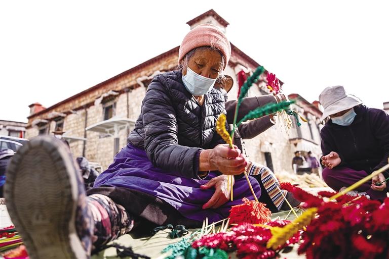 以前,高原植被稀疏,冬日里鮮花更是罕見(jiàn)。人們制作“羅薩梅朵”,讓這一束束“人造的花朵”盛開(kāi)在冬日的高原上,這體現(xiàn)了西藏群眾對(duì)美好生活的熱愛(ài)和追求。正如央金所說(shuō),隨著西藏群眾物質(zhì)生活水平的提高,色彩越來(lái)越鮮艷、品質(zhì)越來(lái)越高的“羅薩梅朵”,正是西藏群眾多姿多彩幸福生活的絕佳體現(xiàn)。