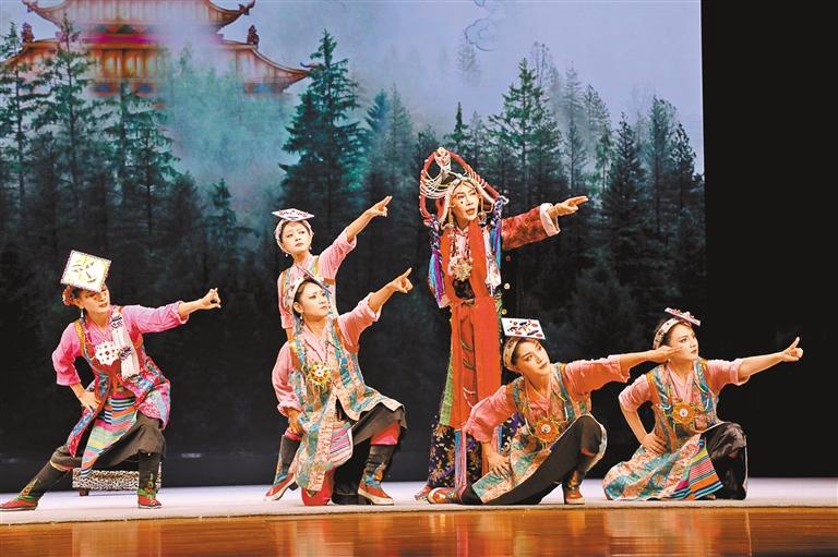 平珍(右三)表演藏戲《卓娃桑姆·尋王》舞臺(tái)照。 圖/文 記者 曉勇 見習(xí)記者 馮琳琳