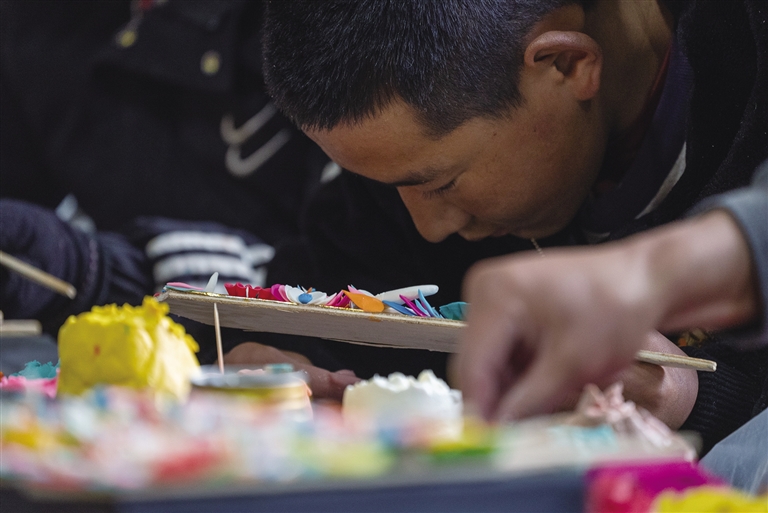 記者看到,捏酥油花的主要工序十分復(fù)雜。藝人們先制作盾形木板作為酥油花的“骨架”,支撐著整個作品的形態(tài)。當天,在幾十平方米的出租屋內(nèi),大家圍坐在墻邊,面前擺放著調(diào)制好的各色酥油和一盆盆清水。藝人們盤腿而坐,進入“敷塑”階段:他們在加工成膏狀的乳白色酥油中揉進各色礦物質(zhì)顏料,調(diào)和成五顏六色的油塑原料,接著熟練地捏取酥油在冷水中浸泡,然后用指尖不斷揉捻、塑形,不時還用小木刀進行精細加工。隨后,在做好的酥油花上微灑清水,使其更加堅固且璀璨奪目。在他們的巧手下,一塊塊酥油很快就變成了日月、花瓣以及猴、象、兔、鳥等各種形狀。為了防止酥油融化,他們不停地將手放入冰水中降溫。