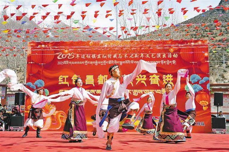 2月28日,全國“村晚”示范點昌都市邊壩縣顯俄村熱鬧非凡,一場以“紅色昌都·振興奮進”為主題的“村晚”文藝演出在此舉行,吸引了1000余名群眾觀看?;顒蝇F(xiàn)場,各族群眾身著盛裝,共同欣賞這場文化盛宴。演出人員用優(yōu)美的舞姿、歡快的節(jié)奏,為觀眾帶來一場活力與激情四溢的視聽享受。