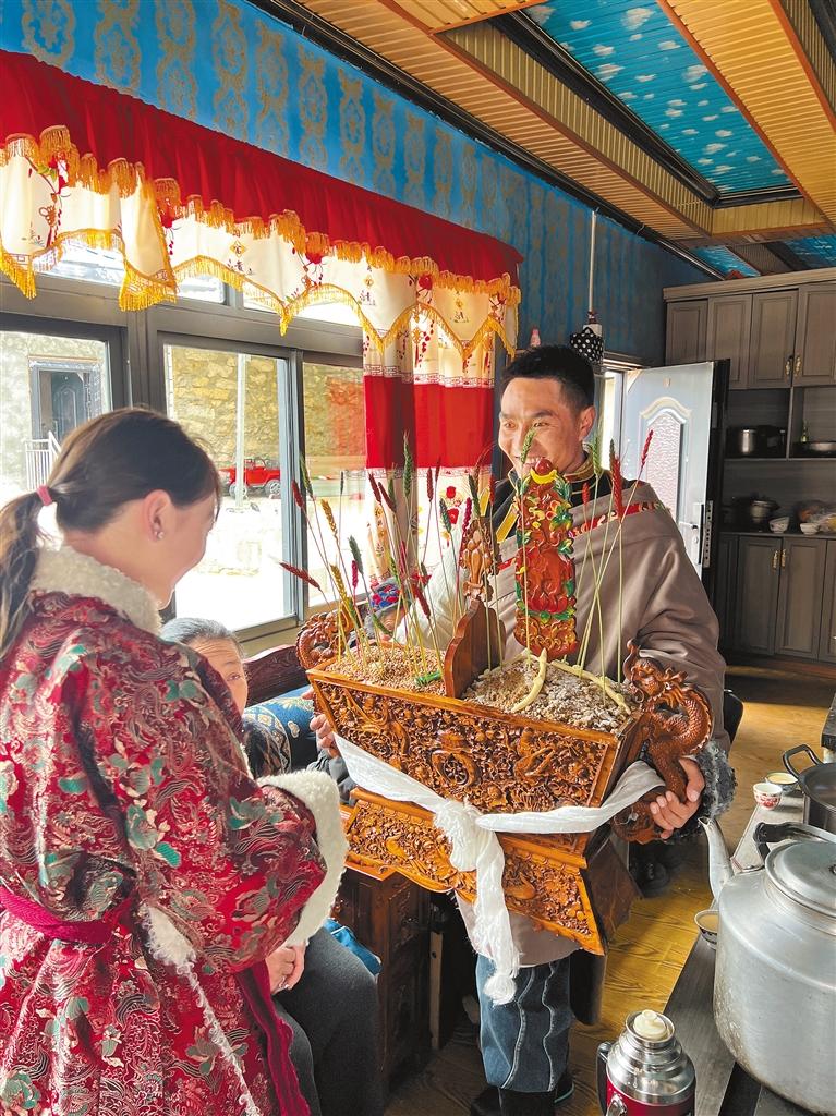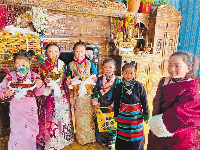 藏歷新年期間,在山南市加查縣崔久鄉(xiāng),身著藏裝的小朋友們帶著家人準(zhǔn)備的“切瑪”,前往村民家中請(qǐng)大家吃寓意五谷豐登的“切瑪”。