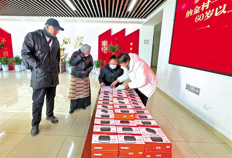 圖為納金村委會工作人員為轄區(qū)老人免費發(fā)放收音機。記者 格桑倫珠 攝