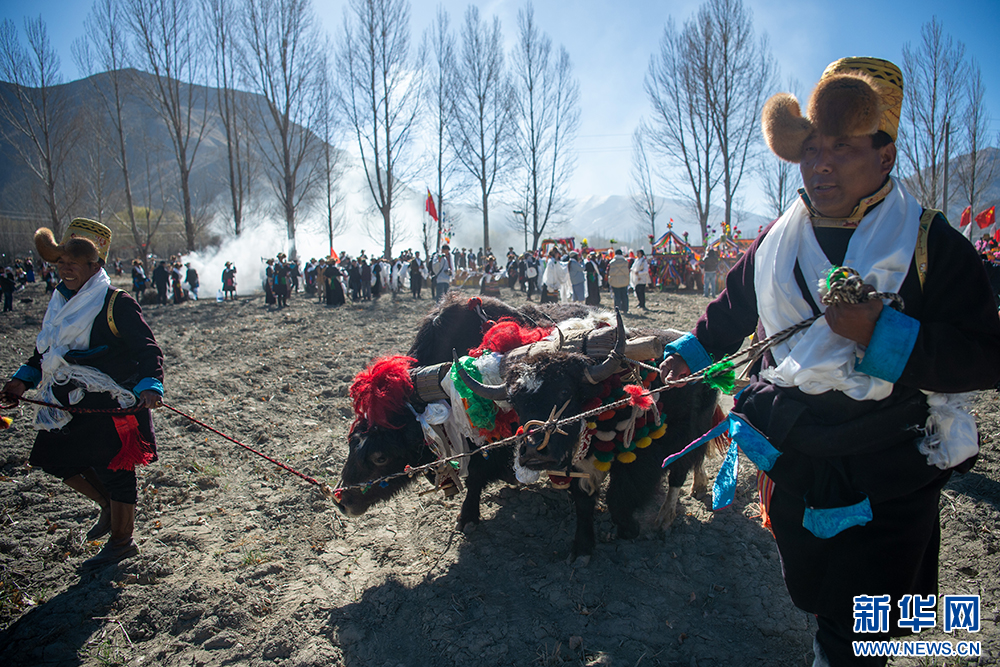 3月16日,在西藏山南市乃東區(qū)門中崗社區(qū)春耕典禮上,當?shù)厝罕姲凑諅鹘y(tǒng)的“二牛抬杠”耕作方式翻土犁地。新華網(wǎng) 旦增努布 攝