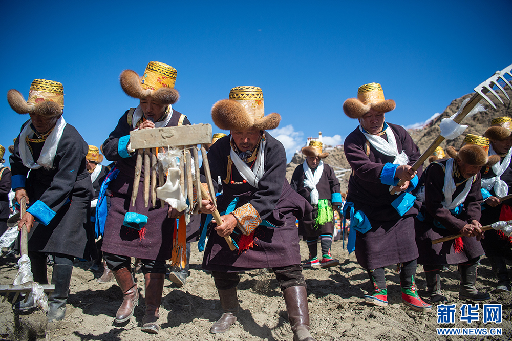 16日,西藏山南市乃東區(qū)門中崗社區(qū)的群眾按照傳統(tǒng)儀式,身著盛裝,手捧青稞酒,在雍布拉康宮殿腳下的西藏“第一塊農(nóng)田”舉行春耕儀式,播撒今春第一粒種子。