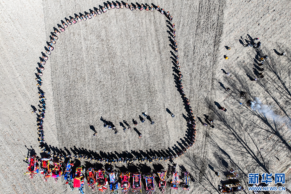 圖為西藏山南市乃東區(qū)門中崗社區(qū)春耕儀式現(xiàn)場(3月16日攝,無人機照片)。新華網(wǎng) 旦增努布 攝
