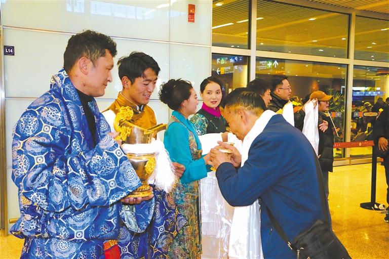 這個(gè)舉動(dòng),讓來自云南、廣東、安徽等地的100多名游客切身體驗(yàn)了一番別具西藏特色的歡迎儀式?!皼]想到一下飛機(jī)就感受到了藏族同胞們的熱情,身體的疲憊感瞬間消散了。”廣東游客彭帆開心地說道。
