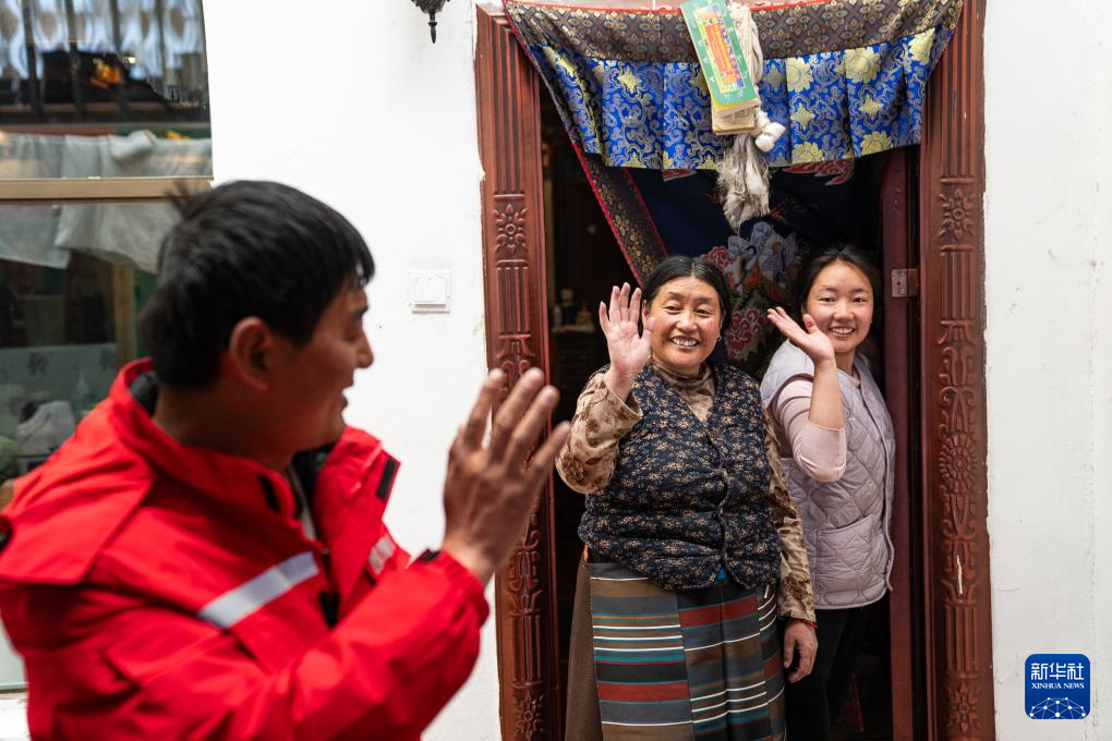 4月26日,西藏錦杭新能源有限責(zé)任公司工作人員入戶檢查完供暖情況后和居民道別。新華社記者 丁增尼達 攝