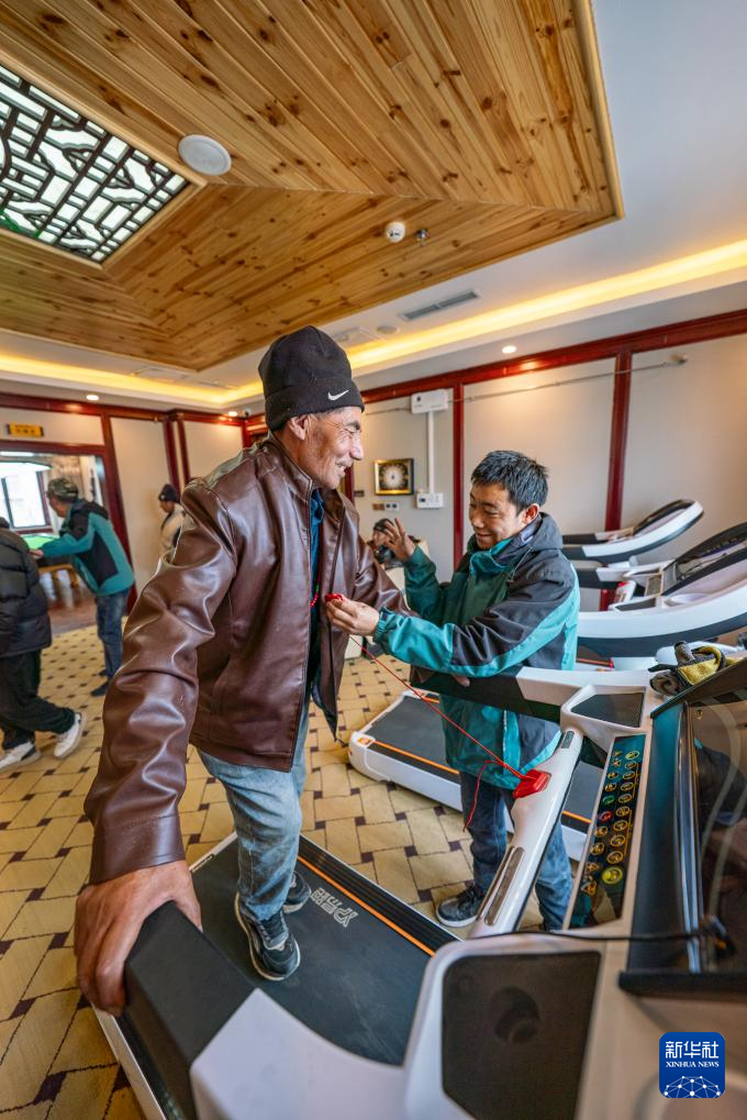 4月25日,在那曲市色尼區(qū)老年人日間照料中心,工作人員陪同老人在跑步機(jī)上做運(yùn)動。新華社記者 丁增尼達(dá) 攝
