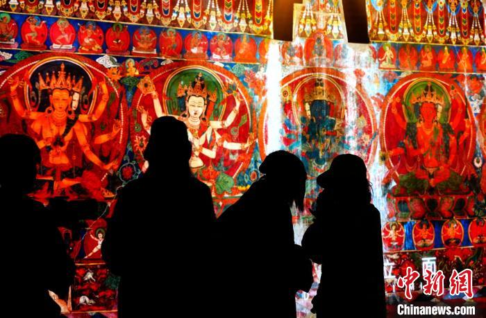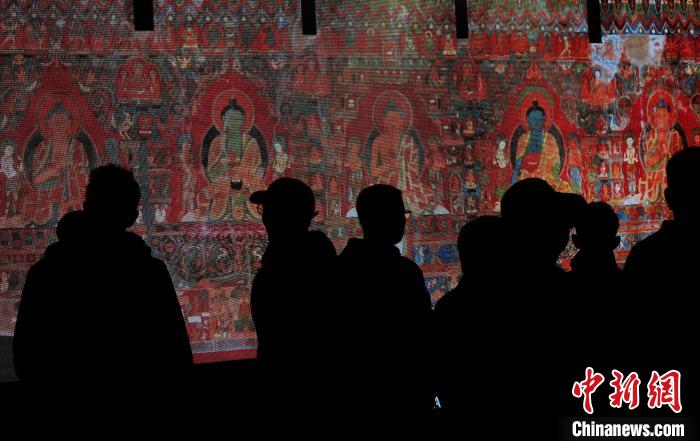 5月18日是第49個(gè)國(guó)際博物館日,今年的主題是“快速變化社會(huì)中的博物館未來(lái)”,西藏博物館迎來(lái)參觀熱潮。圖為觀眾在西藏博物館內(nèi)欣賞阿里古格經(jīng)典壁畫數(shù)字化成果展。中新社記者 李林 攝