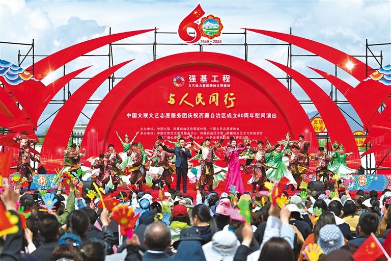 上午10時整,“與人民同行”中國文聯文藝志愿服務團慶祝西藏自治區(qū)成立60周年慰問演出,在歌舞《鼓舞西藏》的熱烈氛圍中正式開場。