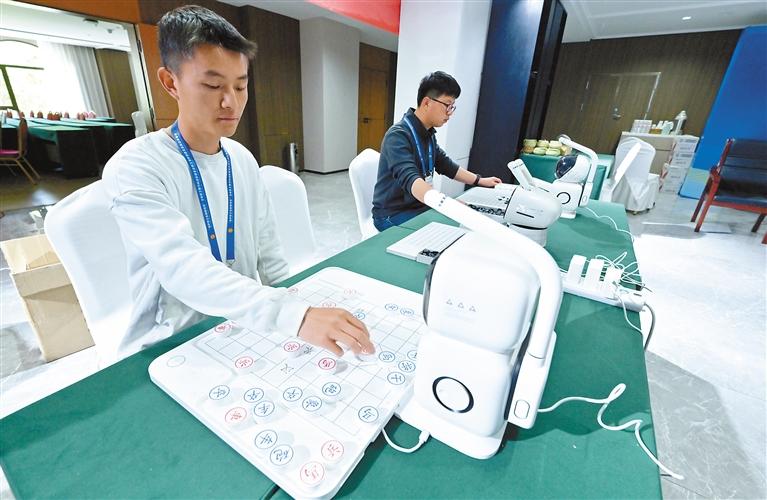 圖為“拉薩職工互助保障杯”智力運(yùn)動(dòng)會(huì)現(xiàn)場(chǎng),象棋選手在賽前與智能機(jī)器人對(duì)弈。記者 唐斌 攝