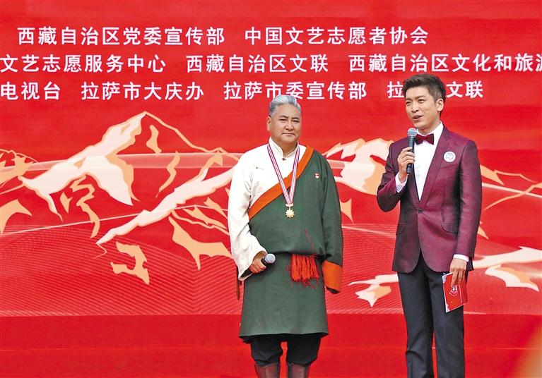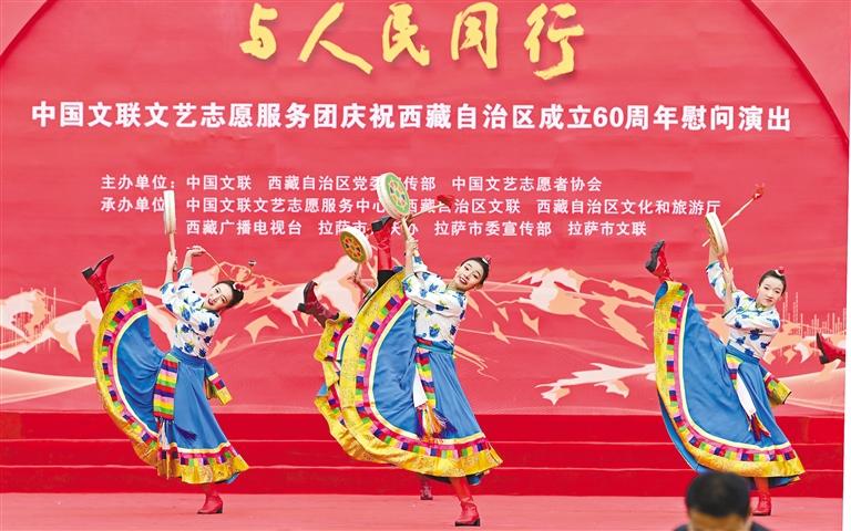 5月23日,在中國文藝志愿者服務(wù)日到來之際,由中國文聯(lián)、西藏自治區(qū)黨委宣傳部、中國文藝志愿者協(xié)會(huì)共同主辦的“與人民同行”慰問演出在西藏會(huì)展中心廣場(chǎng)隆重舉行。這場(chǎng)慶祝西藏自治區(qū)成立60周年的文藝盛宴,在歌舞《鼓舞西藏》激昂的節(jié)奏中拉開帷幕。