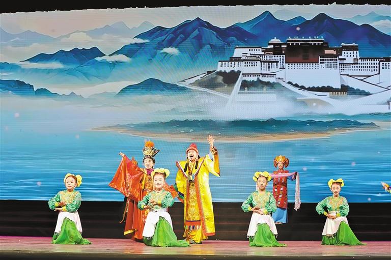 值此西藏自治區(qū)成立60周年、自治區(qū)群藝館(區(qū)非遺保護中心)“少兒藏戲(唱腔)”公益培訓(xùn)十周年之際,首部少兒版《文成公主》藏戲折子戲——《雪域童心頌文成》成功上演。17名平均年齡13歲的雪域少年,以赤誠之心重現(xiàn)漢藏和親歷史,讓人類非物質(zhì)文化遺產(chǎn)在新時代綻放璀璨光芒,奏響民族團結(jié)的時代強音。