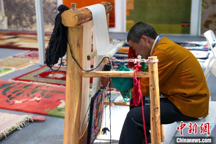 圖為現(xiàn)場(chǎng)展示加牙藏族織毯技藝。中新社記者 薛蒂 攝