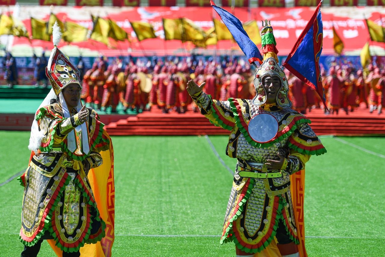 2019年8月10日,“2019年羌塘恰青格薩爾賽馬藝術(shù)節(jié)”在西藏自治區(qū)那曲市開幕。圖為開幕式上的《格薩(斯)爾》說唱表演。中新社記者 何蓬磊 攝