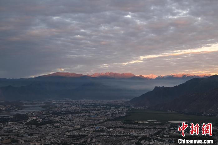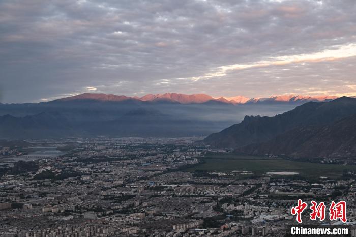 7月5日清晨,西藏拉薩市在薄霧中朦朧蘇醒,天際線泛起粉紫色霞光。布達(dá)拉宮在朝陽的映照下美景如畫。中新社記者 貢嘎來松 攝