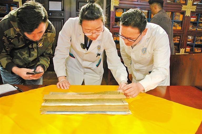 “我們團隊經歷了一段艱難時光,歷時9年?!钡录肽方榻B說,自治區(qū)藏醫(yī)院專門組建一支專業(yè)研究團隊,深入寺廟、檔案館、博物館及醫(yī)學世家,通過實地勘查、文獻考據、學術訪談等多種方式,系統(tǒng)性地開展《四部醫(yī)典》專項調研,足跡遍布國內外。研究人員以藏醫(yī)歷史溯源為切入點,通過查閱海量文獻、拜訪藏醫(yī)泰斗、召開學術研討會等方式,系統(tǒng)追溯《四部醫(yī)典》及藏醫(yī)學的發(fā)展脈絡。