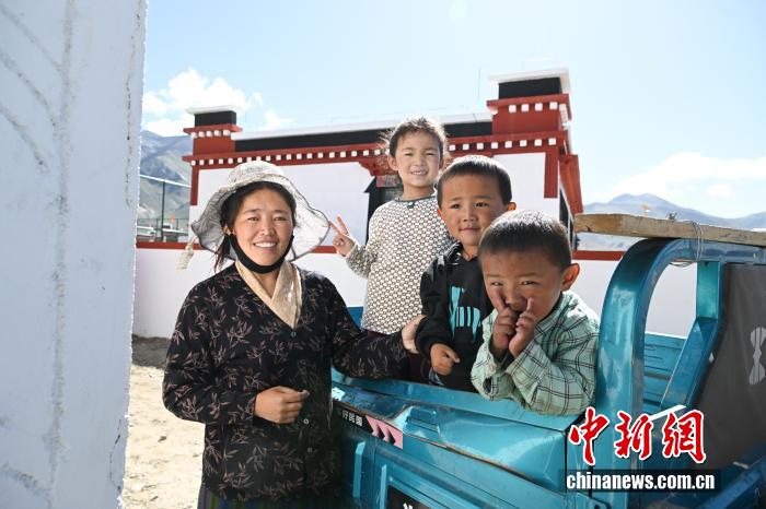 2025年8月15日,西藏日喀則市定日縣森嘎村舉行“定日6.8級(jí)地震災(zāi)后恢復(fù)重建民房首批入住儀式”。圖為森嘎村一戶村民一家在新房門口。中新社記者 貢嘎來松 攝