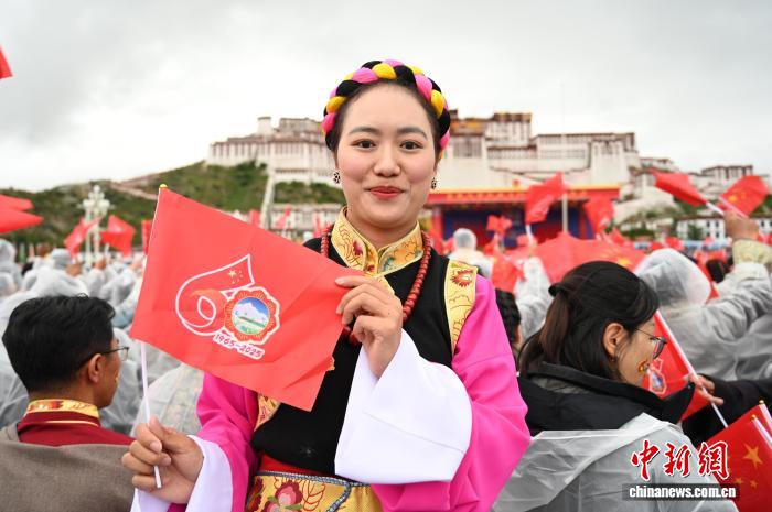 8月21日,拉薩古城居民羅桑群佩在布達拉宮廣場參加慶?;顒?。中新社記者 趙朗 攝