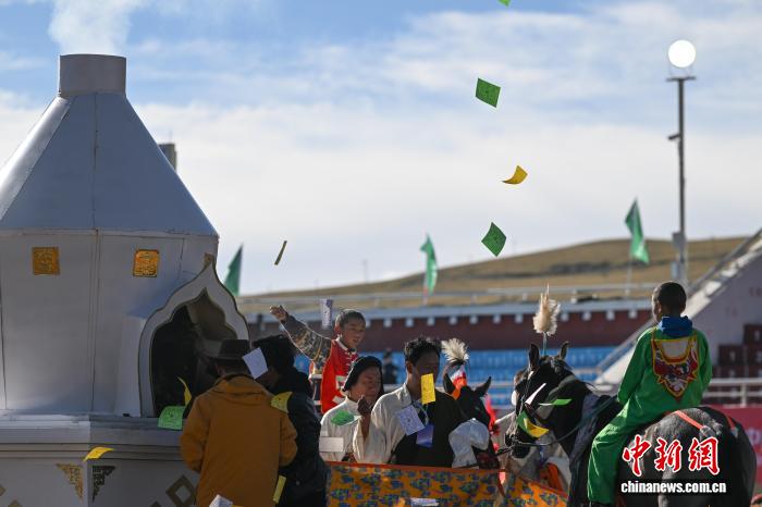 圖為恰青賽馬節(jié)傳統(tǒng)大跑決賽前參賽選手拋灑“隆達(dá)”(風(fēng)馬旗,藏族民眾的一種祈福方式)。中新社記者 貢嘎來(lái)松 攝