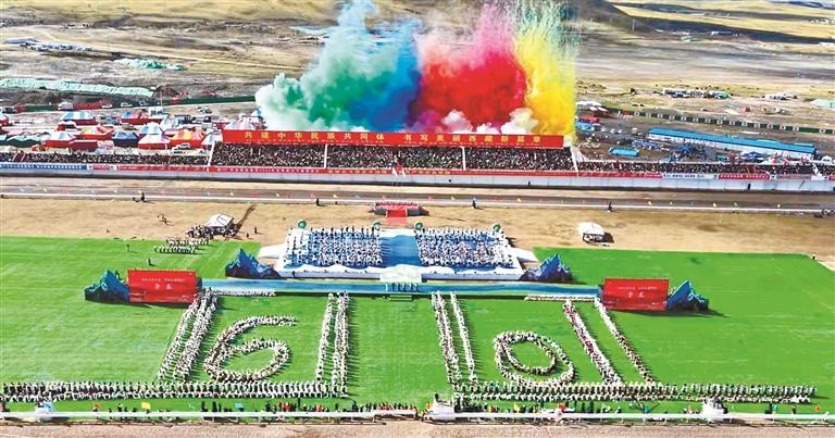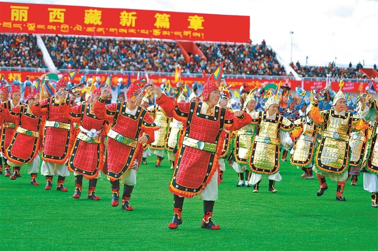 來自四川、青海及西藏本地的馬術隊英姿颯爽,躍馬揚鞭;千人共舞《禮贊甲子》,舞步豪邁,衣袂飛揚,再現(xiàn)西藏六十年的滄桑巨變;器樂合奏《風從浙江來·樂在那曲揚》則巧妙融合江南韻律與草原風情,奏響對口支援的深情厚誼;《馱鹽之歌》悠揚響起,仿佛將人們帶回了古老的歲月,展現(xiàn)了高原兒女堅韌不拔的精神……賽馬場核心區(qū)域,傳統(tǒng)馬術與現(xiàn)代藝術在這里交相輝映,引來掌聲如潮、喝彩不絕。