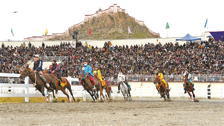 “達(dá)瑪”藏語(yǔ)意為“跑馬射箭”。每年的達(dá)瑪節(jié),賽馬都會(huì)吸引十里八鄉(xiāng)的人們前來(lái)觀賽。賽馬場(chǎng)上人頭攢動(dòng),隨著發(fā)令聲響,一匹匹駿馬如離弦之箭沖出起跑線(xiàn),騎手俯身貼在馬背上,揚(yáng)鞭馳騁,你追我趕,奮勇?tīng)?zhēng)先。觀眾席上,人們隨著比賽節(jié)奏,時(shí)而激動(dòng),時(shí)而安靜,時(shí)而歡呼,時(shí)而嘆息。藏族阿媽次仁卓嘎難掩激動(dòng),她告訴記者,幾乎每年都會(huì)和家人來(lái)看賽馬。賽場(chǎng)上,選手們堅(jiān)韌不拔、昂揚(yáng)向上的精神風(fēng)貌讓人動(dòng)容,也激勵(lì)著一代又一代英雄城兒女為祖國(guó)發(fā)展繁榮而不懈奮斗。