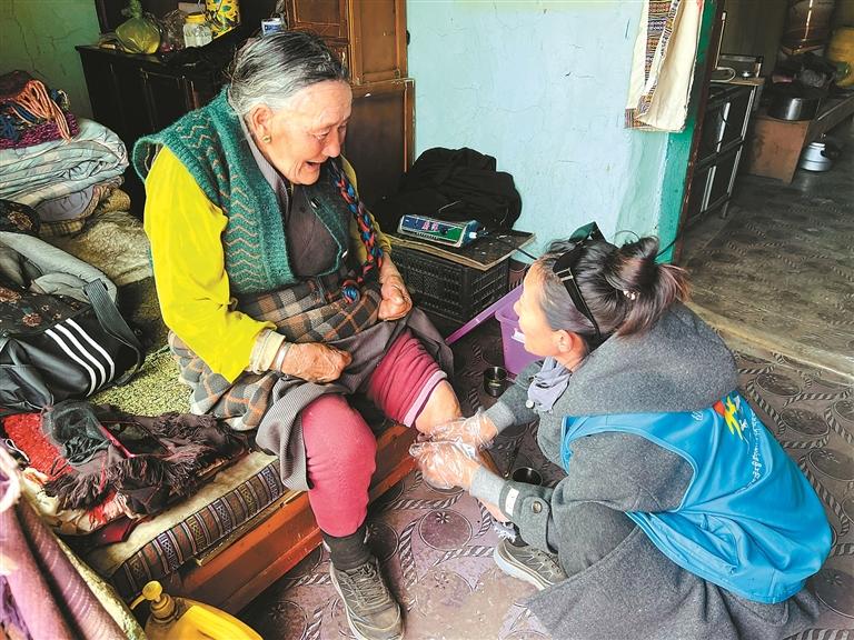 清晨的陽光灑在林周縣春堆鄉(xiāng)卡東村的土路上,林周縣民政服務(wù)站工作人員旦增旺姆背著裝滿蔬菜和藥品的布袋,熟門熟路地走進(jìn)仁增拉卓老人的院子?!鞍尷玻裉旖o您帶了新鮮的蘿卜,再把降壓藥給您續(xù)上。”83歲的仁增拉卓顫巍巍迎上來,拉著旦增旺姆的手笑得眼角堆起皺紋——這樣的清晨探望,早已成為老人日常生活里的“定心丸”。