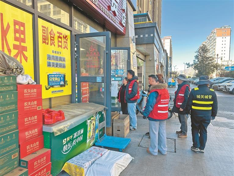 圖為林瓊社區(qū)聯(lián)合城管執(zhí)法部門開展店外店專項(xiàng)整治行動。記者 格桑倫珠 攝