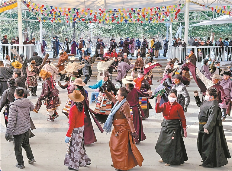 在拉薩市布達(dá)拉宮腳下的宗角祿康公園,每天清晨都有很多市民聚集在一起跳鍋莊。歌聲、笑聲與晨鳥鳴叫交織,勾勒出一幅全民健身、樂享生活的溫暖畫卷。