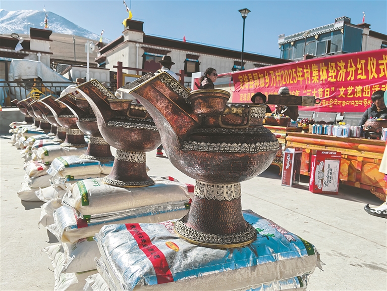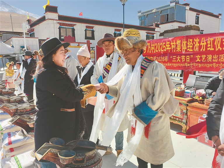 歌舞聲中迎新年,集體分紅暖新居。日喀則農(nóng)事新年期間,日喀則市定結(jié)縣郭加鄉(xiāng)乃村以米面、藏式銅制青稞酒容器等實(shí)物形式,為全村10戶群眾分紅。大家載歌載舞,共同慶祝搬入定日6.8級(jí)地震災(zāi)后恢復(fù)重建新居的首個(gè)新年。