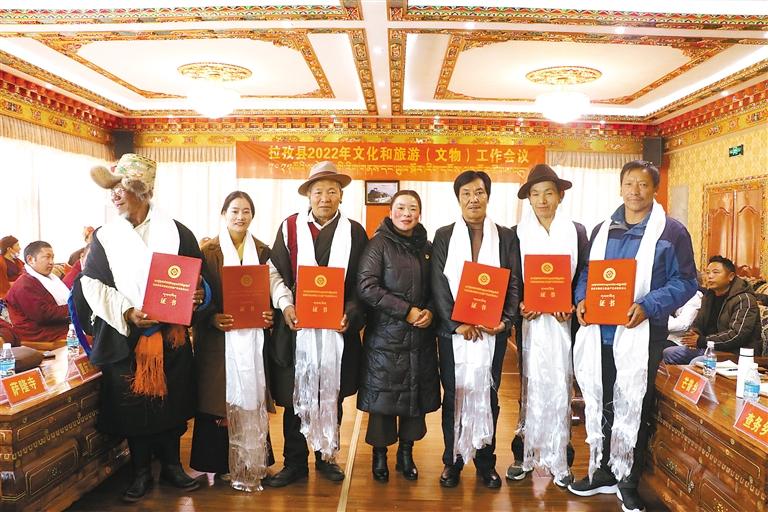 會議總結(jié)了拉孜縣2021年度文化和旅游(文物)相關(guān)工作,向8家文化企業(yè)發(fā)放了市級文化產(chǎn)業(yè)示范基地牌子;7支藏戲隊發(fā)放藏戲傳習點牌子;30家文保單位發(fā)放了文保單位全景圖;8名非遺傳承人發(fā)放了非遺傳承人證書。