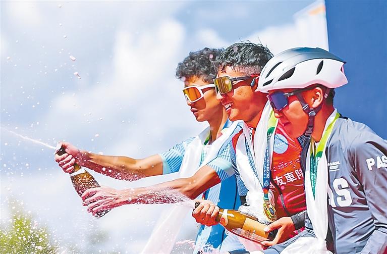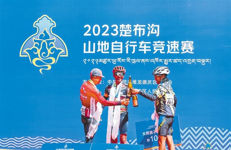 2023年堆龍德慶區(qū)宇妥文化旅游演出季·楚布溝山地自行車(chē)競(jìng)速賽頒獎(jiǎng)典禮上,選手在慶祝獲獎(jiǎng)。