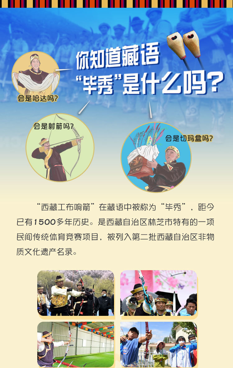 "西藏工布響箭"在藏語中被稱為“畢秀”,距今已有1500多年歷史。是西藏自治區(qū)林芝市特有的一項民間傳統(tǒng)體育競賽項目,被列入第二批西藏自治區(qū)非物質(zhì)文化遺產(chǎn)名錄。[詳細] -