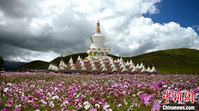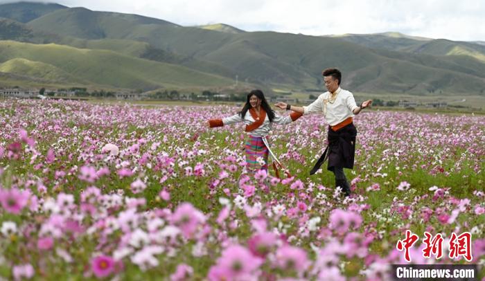 9月9日,四川稻城縣金珠濕地公園一望無際的格桑花海姹紫嫣紅,過往車輛和游客們紛紛下車,走進濕地公園用手機直播和拍照留念。