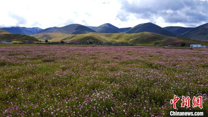 稻城縣噶通鎮(zhèn)八美村位于亞丁機場前往亞丁景區(qū)的交通要道上。長期以來,這片草原沙化現(xiàn)象日益嚴重,當?shù)卮迕褓囈陨娴膫鹘y(tǒng)放牧都難以為繼。2016年以來,稻城縣利用生態(tài)治理工程實施的契機,整合全域旅游和脫貧攻堅等涉農(nóng)涉旅資金,在沙化草原上大面積種植格?;ǎ瑢?599畝沙化草地打造成色拉花海。