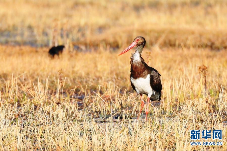 這是11月20日在云南省香格里拉市納帕海國(guó)際重要濕地拍攝的黑鸛。新華社 陳志明 攝