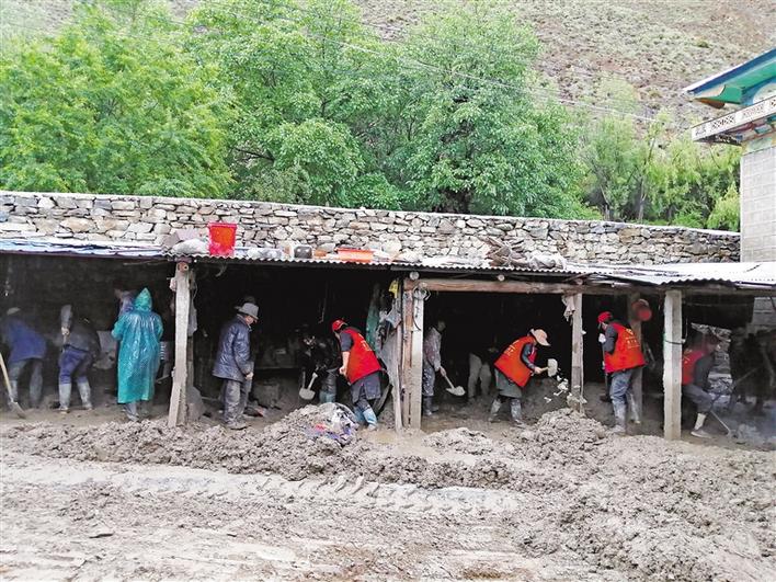 圖為林芝市朗縣滾村“兩委”、駐村工作隊(duì)組織村民開展清理淤泥活動。 史金茹 攝