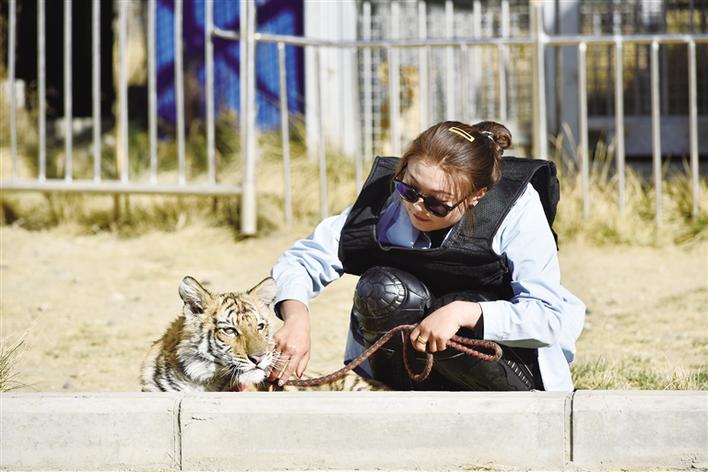 當記者看到四只幼獅時,它們時而聚在一起,時而沿著籠子邊溜達,時而張開大嘴向著外人示威,還有一個非?;钴S的在攀爬籠子。小老虎次仁卓瑪雖然沒有兄弟姐妹的陪伴,不過園區(qū)的獸醫(yī)小姐姐成了它最貼心的玩伴。每天,獸醫(yī)小姐姐都會帶著次仁卓瑪進行戶外活動,次仁卓瑪像小朋友一樣喜歡玩皮球,喜歡追著獸醫(yī)小姐姐跑,還特別喜歡獸醫(yī)小姐姐給它按摩,經(jīng)常會撒嬌求抱抱。
