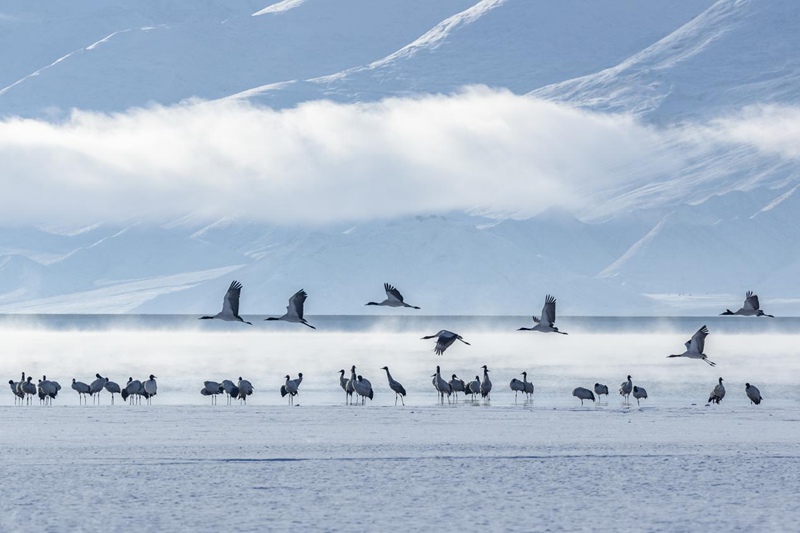 見過銀裝素裹的拉薩,但你一定沒見過在漫天白雪中盡情飛舞的黑頸鶴。茫茫天地間,優(yōu)雅的黑頸鶴沐浴著陽光,直沖云霄。時(shí)值3月,在拉薩林周悠閑越過一冬的黑頸鶴,即將北上,開始新一季的遷徙。這春雪,仿佛就是送給它的離別禮物。